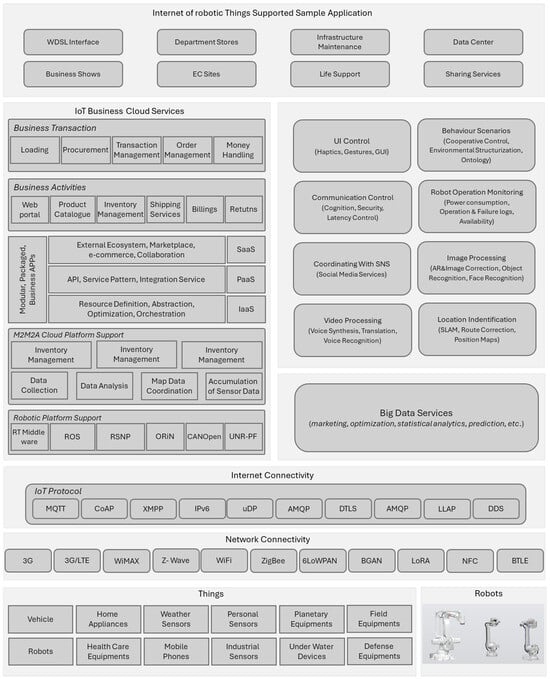 The concept of merging robots and the Internet of Things (IoT) has been labeled as the “Internet of Robotic Things” (IoRT). According to ABI Research, IoRT refers to “intelligent devices that can monitor events, collect data from various sensors, and utilize local and dis-tributed ‘intelligence data’ to determine the best way to operate” []. In [], Figure 4 shows a conceptual diagram of the Internet of Robotic Things architecture.