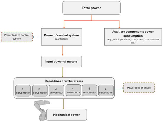 The dynamic development of technology has led to robots being present in almost every branch of industry. Robotization significantly shortens the time required to perform a single operation compared with manual execution. Increasing repeatability and production quality using industrial robots allows for high precision and stable working parameters, and it makes these devices popular for various industrial applications [,,,]. Every machine needs energy, as without it, it does not operate. However, machines vary in terms of how energy-intensive they are. The increase in the implementation of the number of robots used in the manufacturing process, which has occurred due to the addition of more electricity-consuming devices to production lines, leads to a higher demand for electric energy by the company, thereby increasing production costs. Reducing energy consumption can be achieved through technical means, such as the use of energy-efficient drives or other energy-saving devices. Additionally, improving energy efficiency can be indirectly achieved through organizational measures, such as the optimization of cycle times (operations) [].