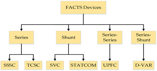 Dr. J. Amarnath et al. suggested the optimal location of Static VAR Compensator at the particular bus that has the most negative sensitivity index for the voltage stability enhancement, whereas the optimal location for Thyristor Controlled Series Compensator (TCSC) is the bus with the most positive loss sensitivity index [144]. Reference [135] examined the effectiveness of TCSC, SVC, and UPFC to study voltage stability in various scenarios by implementing them in a common Newton Raphson power flow. The authors concluded that UPFC amalgamates the benefits of both TCSC and SVC, namely reduction in active power loss and improvement in voltage profile. The authors of [145] proposed a general methodology for the improvement of steady-state voltage stability using FACTS devices in an IEEE 39-bus test system environment. A. Rathi et al. offered a different Distributed Flexible AC Transmission System (D-FACTS), for controlling system voltage by examining sensitivities of voltage magnitudes with respect to variations in line impedances [146]. Figure 1 demonstrates types of FACTS devices, and Table 2 summarizes some important FACTS devices used for voltage stability improvement with special findings asserted by several researchers.