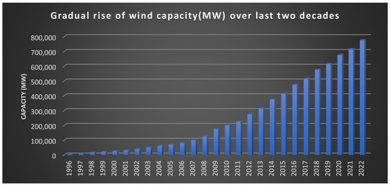 Gradual rise of wind capacity (MW) over last two decades.