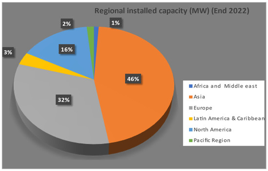 Due to the intensive demand growth for electric power in every sector of life, the appropriate financial and environmentally friendly resources are getting a great deal of attention. The wind energy market has been a far-reaching subject of interest, especially in European, North American, and Asian countries like China in the several past decades. A glance over some statistics about wind power capacity in the near past indicates that the wind capacity has increased from 6000 MW (1996) to 197,000 MW (December 2010) [177]. Up until 2006, the countries with the highest total installed capacity were Germany (20,622 MW), Spain (11,615 MW), USA (11,603 MW), India (6270 MW), and Denmark (3136 MW), and this kept on increasing year after year [182]. In 2015, the increase in wind generation was equal to almost half of the global electricity growth [183]. Globally, the year 2015 crossed the 60 GW mark for the first time in history, and 63 GW of online power capacity was injected to the system. In Asia, China sustained its premiership position and installed 30.8 GW of wind energy at the end of 2015. India remained unbeatable at the second position in Asia and installed 2623 MW for the total of 25,088 MW. The US market, which is the second single largest market after China in terms of total installed capacity, added 4000 new turbines for the total capacity of 8598 MW in 2014 and got a 77% increase over the year 2014 [183]. At the end of 2016, the new installed capacities for different regions around the globe include Africa and Middle East (418 MW), Asia (27,680 MW), Europe (13,926 MW), Latin America and Caribbean (3079 MW), North America (9359 MW), and the Pacific Region (54,600 MW) [178]. The study on the rate and pace of wind energy growth reflects that 12% of all the electricity generation will come from wind resources by 2020 [184,185]. Figure 2 graphically shows the gradual increase in the wind market over the last two decades, whereas the regional installed capacity (MW) by the end of 2016 is shown in Figure 3 [186,187].