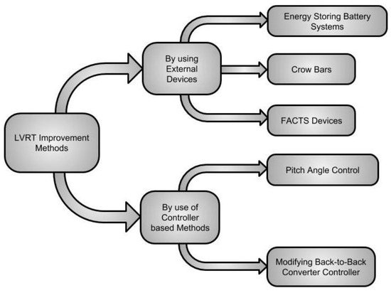 To fulfil these requirements, the authors of [231] presented a novel technique for the on-site assessment of LVRT for Full Power Converter (FPC) wind turbines and showed via MATLAB-based simulations that without any hardware modifications, the on-site LVRT tests could be performed by proper modifications in the control algorithm. Reference [232] pointed out some of the latest methods of improving LVRT. It can exclusively be performed either by using external devices or by controller improvement methods. These have been summarized in Figure 4.
