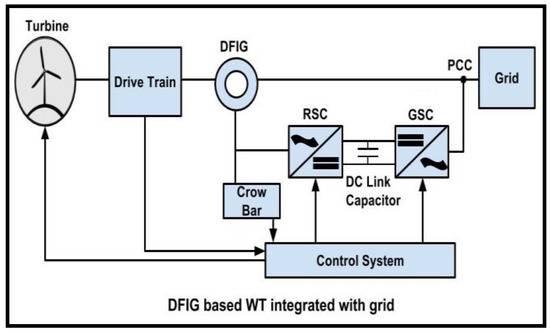In any power system, the stability of the grid functioning and the security of the power system are prominent aspects. For this purpose, the power generating plants, including turbines and generators, must have some suitable methodology and control capabilities. To achieve these objectives, the term Low Voltage Ride-Through (LVRT) is presented, which can be put into words as the requisite to persist in the operation of the generating plants through short periods of low grid voltages [222]. Even if the voltage in any phase becomes less than 80% of its nominal value, then the generators should remain in operation and connected to the power system in an LVRT-capable power system [223]. LVRT is the ability to keep the wind turbines connected with the grid, even under faulty conditions [224]. For wind farms, LVRT is marked as an integral part of grid codes by the regulatory bodies. Popular DFIGs having partial converters do not have the capability of Low Voltage Ride-Through. Non-linear Control-based Modified Bridge-type Fault Current Limiter (NC MBFCL) application has been proposed in [225] for enhancing LVRT capability in DFIG-based wind farms under symmetrical and non-symmetrical faults. One of the top requirements of the grid codes is to keep the DFIGs connected with the load during LVRT.
