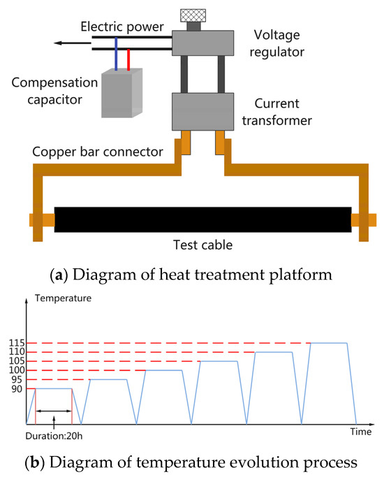 In the second stage, a 5 m long section of the 7-year-serviced 110 kV cable from the first stage was prepared. The cable was cut into four isometric short sections, and the first three sections were subjected to thermal aging using a heat oven (DKM610C, Yamato Scientific) for 60, 120, and 180 days, respectively. Subsequently, the cable was thermally treated to simulate cable operation on a current test platform, as shown in Figure 1a. The simulation involved applying a constant current to the cable; the temperature in the conductor was raised to the preset temperature in 6 h and maintained for 20 h, finally naturally cooling to room temperature. Temperature fluctuation during the experiment was considered, and a difference within 3 °C between the heating stage and the preset temperature was deemed acceptable. Due to the short cable length, XLPE samples were taken from one end of each cable after the heat treatment at each treatment temperature, and the cable’s performance was assessed based on these samples. Prior to the heat treatment, the currents corresponding to each treatment temperature were measured using the unaged cable, and the results are listed in Table 2. Since each aged cable had a length of 1.2 m, a continuous-step treatment process, as shown in Figure 1b, was employed for the heat treatment, with the XLPE taken from one end after the completion of heat treatment at each temperature.