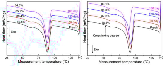 Figure 2 illustrates the first cooling curves of the two aged sheets, with corresponding labeling of the crosslinking degree. Cable B underwent a thermal process during its operation, which could account for the difference observed in the cooling curves during the same aging test. As the sheets aged for 60 days, the cooling peak of sheet B shifted towards higher temperatures. Similar changes were observed as both sheets aged for longer days, although the change in sheet A was minimal when the aging time reached 120 days. Similar phenomena have been reported in [13], primarily attributed to two reasons: (1) the aging temperature is lower than the melting temperature of the sample, and the thicker lamellae corresponding to the melting peak experienced secondary growth; (2) the molecular chain generation via the initial degradation in the service stage promotes the growth of crystals. A continuous decrease in the crosslinking degree, along with damage to network molecules and subsequent chain regeneration, has been shown to be beneficial for crystallization [14]. At the aging duration of 180 days, the cooling peak noticeably shifted to a lower temperature in sheet B, while the position in sheet A remained relatively unchanged. Conversely, a significant decrease in crosslinking degree is a notable indicator of XLPE degradation.