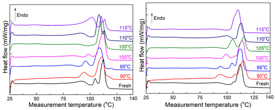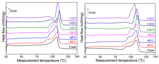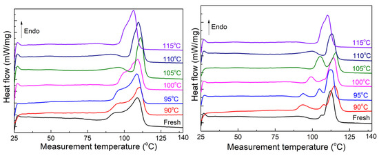 Figure 10 illustrates the melting curves of the XLPE insulation from both cables as a function of heat treatment temperature. The changes observed in the two melting peaks follow a similar pattern to those described in Section 3.2 and Section 3.3. The shoulder melting peak of both samples appears and shifts towards higher temperatures, while slight changes are observed in the main melting peak. When the heat treatment temperature reaches 100 °C, the shoulder and main melting peaks overlap and shift to higher temperatures, resulting in a pointed shape. However, as the treatment temperature reaches 105 °C, the peak moves to lower temperatures and widens.