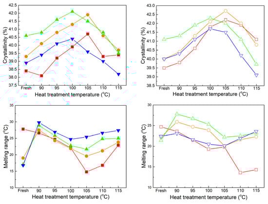 Crystallinity and melting range as a function of heat treatment temperature. (■, ●, ▲, and ▼ represent the unaged, 60-, 120-, and 180-day-aged samples).