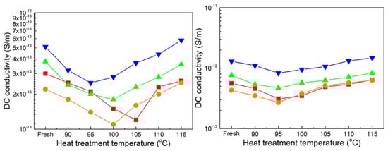 DC conductivity for all treated samples. (■, ●, ▲, and ▼ represent the unaged, 60-, 120-, and 180-day-aged samples).