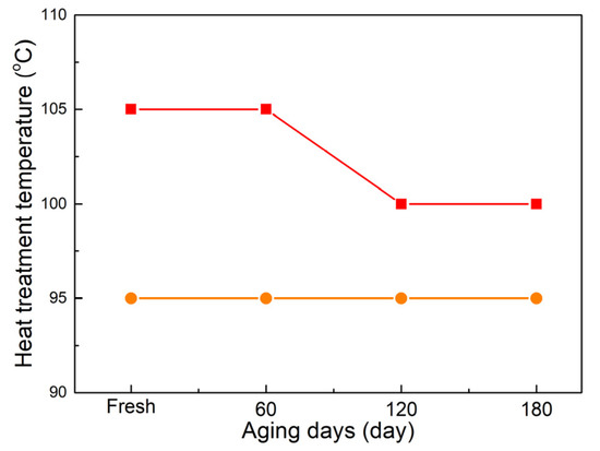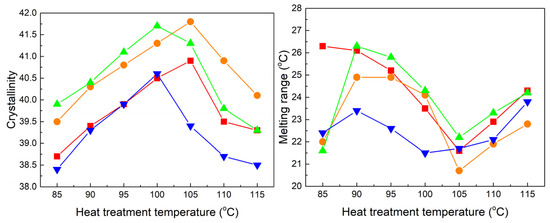Figure 8 illustrates the calculation of crystallinity X and melting range based on Equations (1) and (2). Although the heat treatment was simulated through cable simulation, different from the conditions in a heated oven, the changes in the two factors demonstrate a similar trend, as discussed in Section 3.2. With increasing heat treatment temperatures, the crystallinity initially increases while the melting range decreases. The optimum value of the crystallinity for each sheet was determined by gradually decreasing the temperature, resulting in 105 °C for unaged and 60-day-aged sheets and 100 °C for 120 and 180-day-aged sheets. Conversely, the optimum value of the melting range for each sheet appears to be reached at 105 °C, but the amplitude increases with longer aging days.