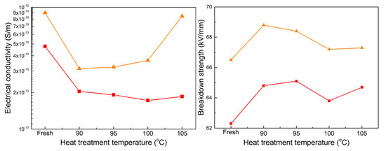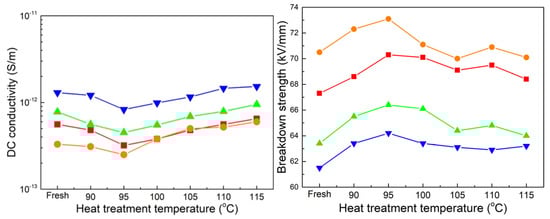DC conductivity and breakdown strength as a function of heat treatment temperature. (■ and ▲ represent the samples from cables C and D).