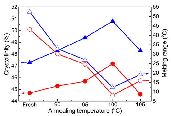 Crystallinity and melting range as a function of heat treatment temperature. (● and ▲ represent the samples from cables C and D; solid symbols represent the crystallinity, and open symbols represent the melting range).