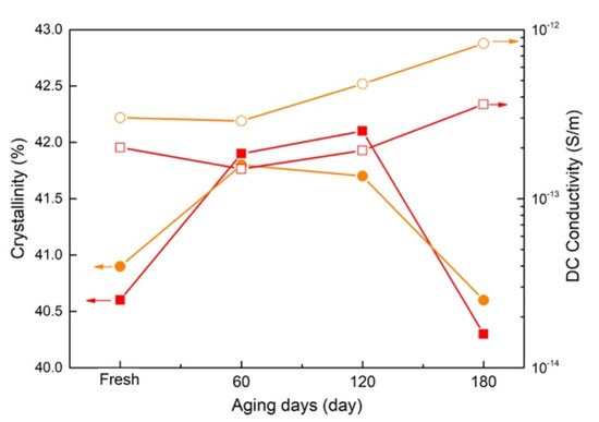 - Huang, C.; Chen, G.; Li, Y. Influence of Crystallinity on the Thermal Aging Behavior and Electrical Properties of Cross-Linked Polyethylene. Polym. Degrad. Stab. 2018, 149, 233–243. [Google Scholar]