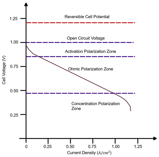 The first works date back to the beginning of the century and were based on a premise still true in today’s works. Those works [36,37] are based on the simulation of the difference between the reversible losses and the irreversible losses that compose the polarization curve. Equation (1) refers to how the polarization curve is defined: