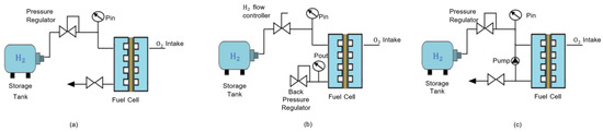 Regarding hydrogen admission, three distinct modes are defined [35]. The first, the dead-end mode, is characterized by working at low pressure and with maximum hydrogen flow for all operating points while expelling the non-reacted hydrogen periodically through an outlet valve. The second, flow-through mode, employs a back-pressure regulator valve and a flow controller to regulate the pressure of the inlet. The third mode is similar to the first but recirculates the non-reacted hydrogen. These three modes are illustrated in Figure 4.