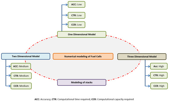 Emulating the behavior of the FC using computational tools allows for a better comprehension of the system without having to physically intervein with it, eliminating the risk of damaging any component. Therefore, correct modeling is of major importance when sensible components are being studied, such as in the case of faults. A plethora of model possibilities have been presented in the literature and based on that, classification was performed, which is visually represented in Figure 5.