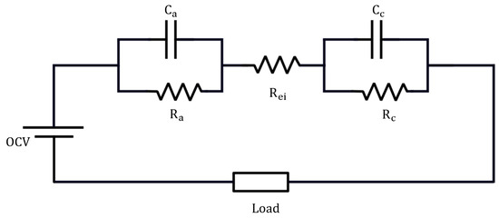 Generic Fuel Cell Equivalent Circuit Model. Legend: : Open-Circuit Voltage; : Equivalent Capacity Between Anode and Membrane; : Anode Transfer Resistance; : Internal Equivalent Resistance; : Equivalent Capacity Between Cathode and Membrane; : Cathode Transfer Resistance.