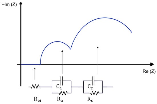 The model in Figure 6 was first introduced in [41]. In Figure 6, the resistor represents the equivalent Fuel Cell resistance and a sudden change in the current is rapidly reflected in the voltage drop across the load. The activation zone is characterized by the capacitor Ca in parallel with the resistor Ra, while the voltage source represents the open-circuit voltage. To estimate the parameters in Figure 6, two distinct approaches were performed: the first one is called the interrupt test, and its operating principle is based on cutting off the current drawn from the Fuel Cell suddenly and analyzing the voltage evaluation until it reaches the open-circuit voltage. This test allows one to collect data related to the activation zone. The second approach is a known parameter estimation technique denoted as Electrical Impedance Spectroscopy (EIS), and it consists of performing a frequency sweep and plotting the graph of impedance versus frequency, also known as a Nyquist plot. An example of how the different elements of the equivalent circuit mode are related to the frequency is presented in Figure 7.