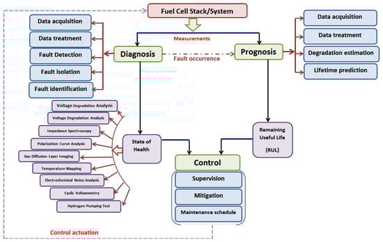 For many years, health monitoring has played a crucial role in engineering systems, ensuring performance, safety, availability, and reliability. Typically, sensors are employed to monitor operating conditions, performance, and loading cycles, allowing for the timely detection of anomalies and faults. This proactive approach helps prevent unforeseen incidents, downtime, and fault propagation. Minor faults within a system component can escalate into major issues, leading to system failure. The early detection or prediction of faults enables timely maintenance scheduling, preventing the development of more serious problems. The application of health-monitoring techniques provides a clear advantage, not only for safety reasons but also by significantly reducing unscheduled maintenance costs. Prognostics, offering information on the State of Health (SOH) and Remaining Useful Lifetime (RUL) of FCs, allows for optimized FC operation through appropriate control strategies. This, in turn, facilitates scheduled maintenance, effectively minimizing downtime [54,55,56].