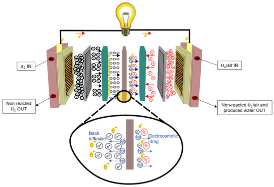 Concerning water management, two major concepts must be mentioned, and they are drying and flooding. The former is characterized by the lack of water content in the membrane, while the latter is the opposite, namely, the excess water content inside the membrane [100]. If the water content inside the cell is not optimized, the protons, which are moving through the hydrated parts of the membrane, cannot successfully cross the protonic membrane. Furthermore, the clear sign of this fault is a decrease in the electric power, but other symptoms are not shared, such as the case of a pressure drop at the cathode, which is only noticeable for flooding [101].