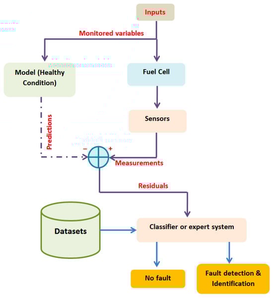 Converting the energy stored in hydrogen back to electricity requires an electrochemical device, such as an FC, which chemically converts the energy present into two reactants, in this case, hydrogen and oxygen, into electricity and heat [4]. Despite the simple theoretical process, the overall composition of the system is still dependent on expensive and rare materials, such as gold and platinum [4]. So, to ensure that the lifetime expectancy increases and the FC system is reliable, a deep understanding of how it operates under different conditions is required; this includes identifying ways to prevent and address any potential issues, like faults [5]. Thereafter, the analysis of fault diagnosis plays a crucial role in ensuring the stable operation and efficient output of FC systems. In recent years, numerous scholars have delved into this area to enhance accuracy and reliability. There are primarily two types of approaches: model-based methods (both qualitative and quantitative) and data-driven methods. In the model-based approach, an accurate mathematical model is developed based on the internal mechanisms of FC system operation [6]. Subsequently, residual vectors are utilized as features for statistical analysis to extract fault information embedded in the residual sequence. This process enables the detection of abnormal situations within the system, but existing fault diagnosis technology falls short in predicting the future degradation trend of FC systems. If the degradation of FCs could be estimated before a complete failure, maintenance personnel would have ample time to devise maintenance plans and replace components proactively. This proactive approach could significantly reduce repair and maintenance costs and prevent the unscheduled downtime of FC systems [7,8]. Faults, or failure modes, have been well established in the literature [9], and some reviews on fault diagnosis have been summarised in [10,11]. For example, in both [12,13], several tests for single and multi-cells under the influence of constant and dynamic loads have been reviewed and analyzed. It has been concluded that ensuring a specific relationship between failure modes and a particular signal, referenced as an indicator, requires an extensive amount of data under various operation conditions. However, there is an evident relationship between the cathode pressure drop and cathode flooding. Moreover, ref. [14] presented different model and non-model diagnosis methods for FC, while ref. [15] focused more on non-model-based diagnostics approaches. The conclusion drawn was that, when compared to model-based techniques, non-model-based approaches require a larger dataset of both normal and faulty conditions. Nevertheless, they are considered a prominent method for FC fault diagnosis due to their simplicity, flexibility, and ability to handle system uncertainties.