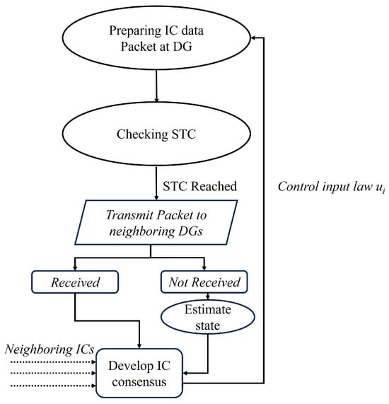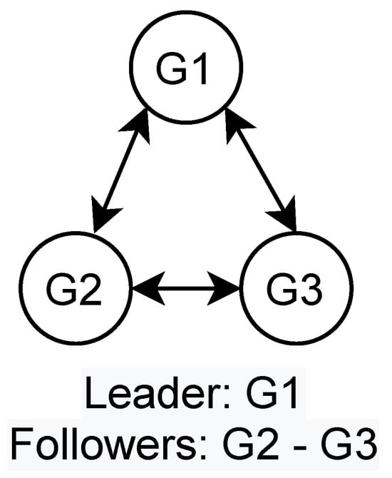 One of the significant challenges of a distributed ED approach is obtaining consensus among the various agents (DGs or loads). Consensus control algorithms can be used to overcome the challenges of developing consensus among agents in dynamic systems. They are broadly classified as leader–follower-based and leaderless consensus control []. In leader–follower consensus, one or a few agents are designated leaders, and all other agents follow the leader(s). Only a few followers are directly connected with the leader in this approach. However, other agents are expected to indirectly access the leader’s information via agents connected to the leader [].