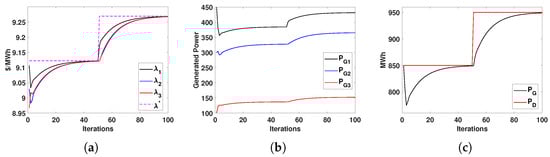 Here, we consider a scenario in which three power-generating units are trying to meet the system’s power demand , as shown in Figure 2. One of the units is designated as the leader, and it is expected to achieve the optimal cost. The other two agents act as followers, trying to reach a consensus with the leader. The parameters used to calculate the incremental cost for the simulation were taken from [] and are given in Table 1.