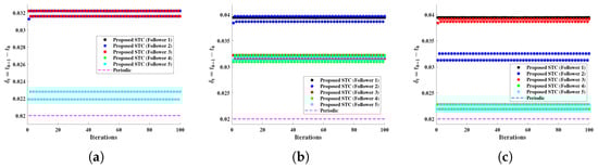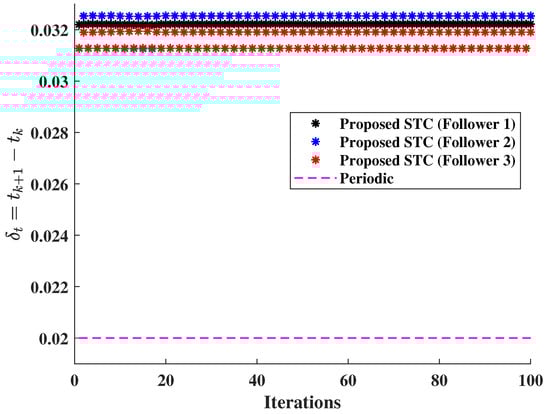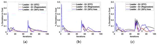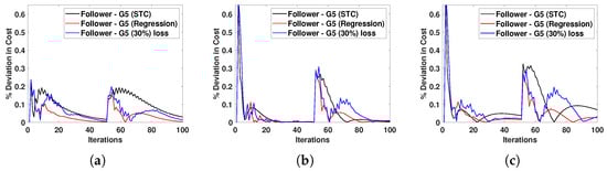 In these three scenarios, the initial power demand was 850 MW, and the corresponding optimal cost was MWh. As shown in Figure 8, it is assumed that the power demand changed to 950 MW after 50 iterations. The incremental costs of the system for the considered network topologies 1, 2, and 3 are shown in Figure 8a–c, respectively. For topology 1, shown in Figure 8a, where most followers could directly access the leader G1, convergence was expected to be very fast, and all DGs were expected to develop consensus quickly. The simulation was run using the exact periodic sampling of s used in [], and the results in Figure 8a validate that the consensus convergence of the topology was smooth and fast due to multiple followers accessing the leader state. The convergence time increased in Figure 8b since the number of followers accessing the leader was reduced. This convergence further slowed, as shown in Figure 8c, where only one follower could access the leader DG. Moreover, the incremental cost consensus was directly related to communication between the leader and the followers. The results using a periodic inter-sampling time were compared with simple STC (34) and our proposed regression-based STC (39). The percentage deviation in the ICC for the leader and a follower is shown in Figure 9 and Figure 10, respectively. The results show that the proposed regression-based STC performed better than the simple STC. The proposed STC was also validated over a lossy channel with a 30% packet loss, where the regression-based STC was used to estimate the loss in state information. The results demonstrate that the ICC was impacted by less than 0.5% when using the proposed STC, even with a high loss in state information of 30%. The inter-sampling time calculated using STC (34) for each DG is shown in Figure 11. The results show that the inter-sampling time increased significantly using the proposed STC for all agents compared to periodic communication while not significantly impacting the convergence of the ICC.