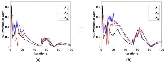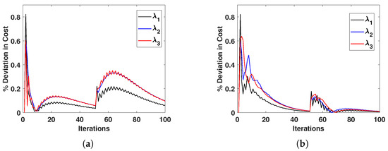 With a lossy, multi-access communication medium between the agents, e.g., a wide-area wireless network, data packet loss can occur in the communication system. The proposed linear regression methodology also helps mitigate the effects of data losses, and the agents can still obtain a consensus by estimating the neighbour’s latest state information from the previously stored values. Here, we considered two scenarios of data losses (30% and 50%), and the cost deviation from the ideal communication scenario is depicted in Figure 6a,b, respectively. The results show that the percentage deviation of the incremental cost was less than , although there was a 50% data loss.