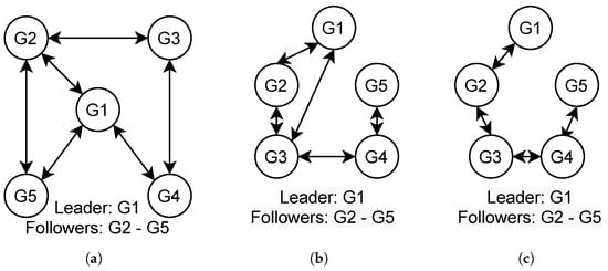 In this section, we consider a more complex distributed power generation network scenario comprising five units in three different network topologies, as shown in Figure 7. Figure 7a (‘topology 1’) depicts a random network topology in which some agents can access the leader directly, while others are not directly connected to the leader but reach a consensus with their neighbours. Thus, all agents in the system achieve incremental cost consensus. In the considered random architecture, acts as the leader; hence, it can access the difference between the current and generated power demand. is not directly connected to all followers. For example, does not obtain any information directly from the leader but obtains it through its neighbours, and (see Figure 7a). Figure 7b depicts a scenario with a network topology (‘topology 2’) with fewer edges. In this architecture, agent is directly connected to only two neighbours, and agent is three hops away from the leader. Figure 7c (‘topology 3’) shows a scenario with a linear topology, where each agent has the minimum number of network connections. In this architecture, agent is directly connected to only one neighbour, and agent is four hops away from the leader. The parameters used to calculate the incremental cost consensus for the five-agent system were obtained from [] and are shown in Table 2.