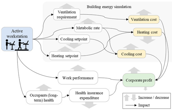 This study focuses on quantifying the building’s energy consumption influenced by the active workstation. Figure 1 presents the research flow and scope of this study. The impact of each factor is connected by a black-lined arrow, whereas the results (increased or decreased) are shown by a gray-shaped arrow. The scope of this study is shown by a shaded rectangle titled “Building energy simulation”. The impact of the remaining part is not calculated or quantified but has been addressed in the introduction. Therefore, unfortunately, the total cost that could be regarded as the annual profit and expenditure for employee health insurance is not recorded.