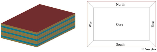 Figure 2. EnergyPlus commercial reference building of the medium office ((left): 3D view, (right): floor plan).