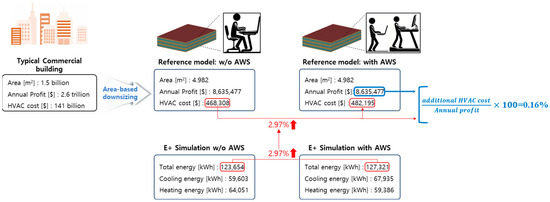 Figure 5 illustrates the cost analysis result of the active workstation. First, the annual profits of the average U.S. commercial buildings in the first quarter of 2023 were surveyed based on the information in literature [47] published by Trading Economics, U.S. Additionally, information on HVAC costs and areas in commercial buildings were investigated based on the U.S. Energy Information Administration [48,49] (Source Credibility: The HVAC cost and area data for commercial buildings were derived from the U.S. Energy Information Administration (EIA), a highly reputable and reliable source for energy-related information. The EIA is known for its comprehensive and up-to-date data on energy consumption, pricing, and utility costs, making it an appropriate source for our study) (Contextual Relevance: The EIA data reflect broad trends and averages across a wide range of commercial buildings in the U.S. These broad-based data provide a solid foundation for generalizing the HVAC costs to the type of medium-sized office buildings modeled in our study.). The findings revealed an annual profit of $2.6 trillion, HVAC costs of $141 billion, and an average area of 1.5 billion m2 for commercial buildings. The annual profits and HVAC costs per floor area were $1733/m2 and $94/m2. Then, the annual profit and HVAC cost were downsized following the floor area of the typical commercial building and reference building model. It was found that the annual profits (Pref) and HVAC cost (Cref) of the scale-downed reference model are $8,635,477 and $468,308 based on the following equations: