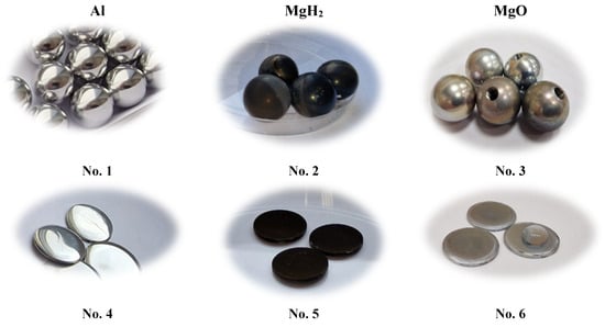 Spherical samples of diameter of D = 19.05 mm and plates with a diameter of D = 15 mm and a thickness of 1.2 mm were taken from high purity aluminum (99.99%) to conduct experiments. For the observation of critical temperature variation and different conditions investigation, the main attention was focused on the surface impact. Spherical samples’ surface was covered/prepared with different materials: magnesium hydride (the main investigation material) and magnesium oxide (the additional material that was selected to evaluate the differences between oxide and hydride). A polished aluminum surface was chosen as the reference surface/coating. Several studies have been conducted [,], proving that this surface allows to reach the low critical temperatures at which the Leidenfrost phenomena occurs. The surfaces of reference samples were smoothed with 3M Hookit abrasive discs with a roughness of P-1000, P-3000, and P-4000. The final surface of the specimens was polished using a paraffin-based abrasive compound. Magnesium hydride (MgH2) was deposited using DC sputtering magnetron deposition system and 1 A magnetron current, 400 V ± 20 V magnetron supply voltage. The chamber was pressurized to 5.5 mTorr with argon, and then to 120 mTorr with hydrogen gas. The deposition took 1 h. The physical vapor deposition system with a circular magnetron was employed to deposit magnesium oxide (MgO) films. A magnesium target (95 mm, 99.99% purity) served as the primary cathode material in the sputtering process. Prior to deposition, the chamber was brought to a base vacuum pressure of 3 mTorr using rotary and diffusion pumps. The magnetron sputtering process occurred under a pressure of 40 mTorr, utilizing a mixture of O2 and Ar gases introduced into the vacuum chamber. The Ar gas was introduced up to 8 mTorr, followed by injection of O2 up to 40 mTorr. The samples were positioned beneath the magnetron, keeping a distance of 7 cm between the target and the sample holder. Power for the magnetron was supplied by a pulsed DC power source with a current of 1 A and a voltage of 160 V ± 20 V. The duration of the deposition process was 5 h. The thickness of the MgH2 film was approximately 2 µm, while the thickness of the MgO film was about 150 nm. The surfaces of MgH2 and MgO coatings replicated the surfaces of the specimens, although the roughness of the coatings was not assessed. The examples of samples used in experiments are shown in Figure 1.