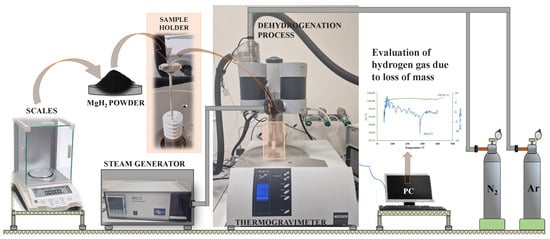 Thermogravimetric analysis (TGA) was conducted using the NETZSCH-Gerätebau GmbH (Selb, Germany) STA 449 F3 Jupiter analyzer with silicon carbide heater. For this analysis, magnesium hydride powder was obtained by mechanically removing it from aluminum plates, onto which the material was previously deposited using reactive magnetron sputtering. A sample of approximately 1.87 mg of magnesium hydride powder was loaded post-calibration into Al2O3 crucible, placed in a S-type thermocouple-equipped chamber and heated at 20 K/min from 40 °C to 510 °C under 40 mL/min Ar gas flow and 20 mL/min N2 flow when using mixed gases. The differential thermogravimetric (DTG) curves were produced by numerically deriving the thermogravimetric (TG) curves. For some TGA analysis steps, the material adhered to prepared aluminum samples (plates) was used. The sample with aluminum plate was loaded post-calibration into another Al2O3 crucible, placed in a S-type thermocouple-equipped chamber and heated at 20 K/min from 40 °C to 280 °C, followed by 5 K/min from 280 °C to 400 °C under 40 mL/min Ar gas flow and 20 mL/min N2 flow when using mixed gases, or 60 mL/min argon flow when using only argon as carrier gas. If steam was used during thermogravimetry, the relative gas humidity was set to 50%. The differential thermogravimetric (DTG) curves were produced by numerically deriving the TG curves. This method was used to identify the starting point of the dehydrogenation process of MgH2, and mass loss peaks were also evaluated (Figure 2).