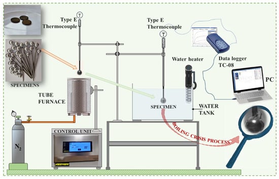 Experiments with spherical samples were conducted on the experimental bench, which was designed and constructed in the laboratory (Figure 3). Experimental bench consists of four main parts: (1) tube furnace, (2) water tank, (3) water heater, and (4) data collection system. The investigations of critical temperature points were performed in two stages. In the first step, the prepared spherical sample was heated up until the temperature required for the experiment was reached, while, in the second step, the sample cooling dynamics was recorded. Before starting the experimental investigation, a tube furnace was switched on and a desired sample temperature was set (200 °C, 300 °C, 450 °C). During the experiment, the nitrogen gas was fed from the bottom of the furnace at the rate of 2 L/min. When the sample reached the set temperature in the tube furnace, the sample was lowered down into the water tank. The sample surface temperature was captured and registered by an E-type thermocouple paired with data logger TC-08 system. A water heater was used to maintain the temperature of water tank at fixed temperatures: 20 °C, 40 °C, and 60 °C. The choice of water temperature was based on both the possibilities of Leidenfrost formation and the realistic temperature of the water in the environment. Three repetitions were conducted under identical conditions to obtain accurate results and determine the deviation of the obtained experimental data. At the observed Leidenfrost point temperature, the deviation ranged from 2 to 4%, while in the temperature range from 450 °C to 200 °C, the deviation fluctuated between 2 and 10%. The aim of these investigations was to identify the critical temperature formation boundaries (Leidenfrost temperatures) when investigating different samples, whose surface properties have an impact when reaching critical temperatures.