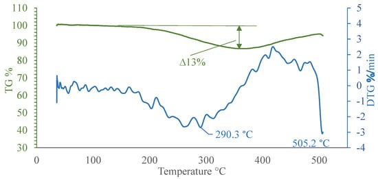 Thermogravimetric (TG) analysis using Method 1 revealed that volatile content [] (most of the hydrogen) in the sample reached around 13% by mass. In addition, the TG curve shows the variations of MgH2 mass, starting from 200 °C and continuing to 350 °C. The most intense mass loss was observed at a temperature of 300 °C. After reaching 350 °C, the mass of the sample started to increase, which shows a possible formation of oxides on the surface []. The curves of MgH2’s mass loss rate (Figure 4, DTG curve) confirm that hydrogen separation took place in the first step, while the formation of oxides and hydroxides took place in next stage. The conditionally thermally stable MgH2 sample could be stored up to 200 °C, which determinates the initial temperature value when applying Method 2.