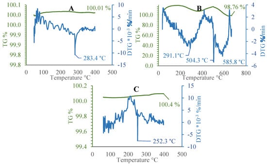 Additional experimental tests were carried out on MgH2-coated sample plates in order to select the temperature range that will serve as the working range for Method 2. Given that the mass of the aluminum sample were significantly higher than that of the thin-film coating, the results are therefore valid only if they show the most significant changes, such as a sudden change in the mass loss rate of the DTG curve (Figure 5).