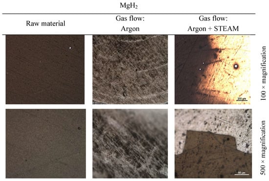 The surface analysis with magnesium hydride (MgH2) as the main material in this study and using Method 3 (Figure 6) was carried out under three different sets of conditions: the surface was evaluated immediately after deposition via the magnetron sputtering technique; the surface passed the heating cycle to the set temperature in an argon environment; and the surface passed the heating cycle to the set temperature in an argon and steam environment. The surface evaluation was performed using optical microscopy in ×100 and ×500 magnifications.