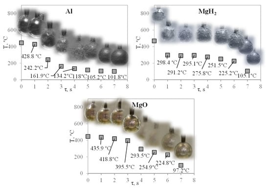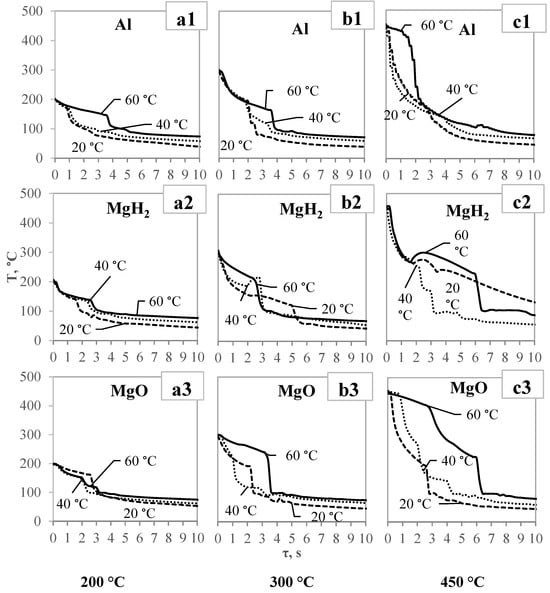 The main objective of this investigation was to identify critical temperatures (Leidenfrost temperature) at points where continuous vapor generation process takes place in the case of non-stationary heat transfer. In order to evaluate the impact of the MgH2 coating for Leidenfrost formation, both MgO and polished Al surface samples were tested under the same conditions when recording cooling dynamics according to Method 2. Experiments were conducted for different water temperatures: 20 °C, 40 °C, 60 °C. The initial temperatures of samples were set at 200, 300, and 450 °C, considering the dehydrogenation process discussed in Section 3.1.