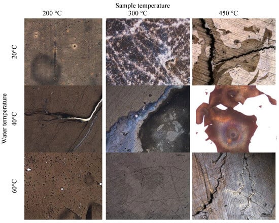 One common tendency (Figure 9) that can be observed during the analysis of surfaces using Method 3 is as follows: the temperature of water is not the most influential factor, whereas a higher temperature of the sample leads to thinner and thinner film remaining upon an interaction with water. In some cases, upon heating the film, it visibly changed after interacting with water. In these cases, it is very likely that due to various temperatures and reactions with water, the hydride undergoes dehydrogenation (up to 300 °C). The film remains intact in rapid reactions with water at lower temperatures of the samples (200 °C, 300 °C), and then slowly reacts with water. However, high temperatures of samples (450 °C) and sudden cooling indicate that the film is vulnerable and begins to flake off in pieces. Flaking indicates a difference in thermal expansion coefficients during rapid temperature changes, the thermal contraction is also very quick, which also negatively affects film adhesion.