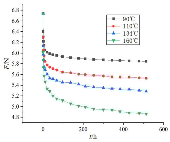 Degradation experiments on the electromagnetic release were carried out at four temperature points, 90 °C, 110 °C, 134 °C, and 160 °C, and the curve of the data of the total reaction force with time is shown in Figure 4. The degradation curve of the reaction force at various temperatures is shown in the figure to be primarily divided into two stages: as time passes, the degradation rate slows down to enter the second stage, which lasts for a long time, and the degradation gradually tends to stabilize. The slope of the curve in the first stage is very large, indicating that the degradation rate is faster at this time, and the duration is very short. The degree of degradation is also positively correlated with the temperature.