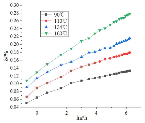 Since the degradation data obtained are non-linear with respect to time, which is not favorable for curve fitting and prediction of life, the curve was processed using the logarithm of time as the horizontal coordinate and the rate of loss of reaction force as the vertical coordinate to obtain the curve shown in Figure 5, where the rate of loss of reaction force is defined as follows: