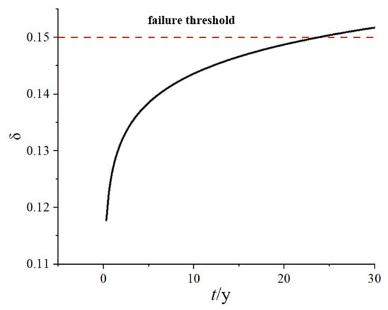 The electromagnetic suction force is measured to be 5.729 N through the experiments, and the sum of the initial reaction force is 6.74 N, i.e., when the rate of the loss of reaction force is 15%, it is considered that the electromagnetic release reaches its failure threshold value. These failure conditions state that the electromagnetic release fails when the sum of the spring reaction force and the striker counterforce is less than 80% of the electromagnetic suction force at the short-circuit setting current. According to the experimental results, the electromagnetic release has a failure time of 23.699 years.