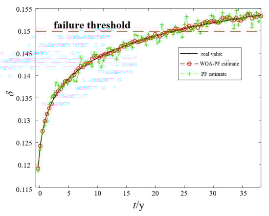 The prediction results of this paper’s method are compared with those of the conventional particle filtering method in order to confirm the efficacy of the WOA-PF remaining useful life prediction method. The traditional particle filtering method only uses the optimal parameters at the moment to iteratively space equations to predict the future state; it does not use the estimated observations for tracking. In the case of fewer particles, the WOA-PF prediction algorithm can achieve a more accurate estimation of the system state, improving the problem of particle depletion that exists in the traditional filter, and constantly corrected according to the current observations. The results of the two methods’ predictions are displayed in Figure 7. As can be seen from the figure, the curve predicted by the WOA-PF method is less likely to exhibit fluctuations and is closer to the true remaining useful life curve than the curve predicted by the PF method.