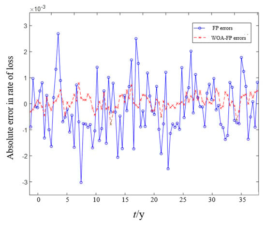 The error curves for the loss rate and the true value predicted by the WOA-PF and PF algorithms are displayed in Figure 8. From these, it is clear that the PF algorithm’s error range is and the WOA-PF algorithm’s error range is . Additionally, the error predicted by the WOA-PF method is less than the error predicted by the PF method. The enhanced algorithm predicts more accurately, and as the number of iterations increases, the error progressively drops. This is because the electromagnetic release’s later degradation is smoother, and the WOA-PF algorithm’s prediction is more stable.