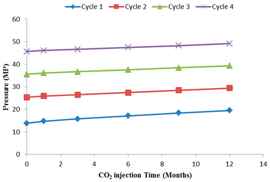 In all the investigated scenarios of the CO2-water ratio, a total of 4 million tons of CO2 were injected at a depth of 1383 m during the course of 4 CO2 injection cycles, each lasting 1 year. The CO2 injection rate was 1 million ton per year. Following each cycle of CO2 injection, there was a phase of water injection lasting one year at a depth of 1243 m. The water injection rates for the 2:1, 1:1, and 1:2 CO2-water ratios were 0.5 million ton/year, 1 million ton/year, and 2 million ton/year, respectively. In the absence of a water injection, specifically in the case of a continuous CO2 injection, a constant CO2 injection rate of 1 million/year was employed (Table 1). Figure 2 shows the pressure changes with the injection of CO2. After each injection, a storage period of 100 years was implemented. During this period, the movement of the CO2 plume, dissolution, and residual trapping of CO2 were calculated and analysed.