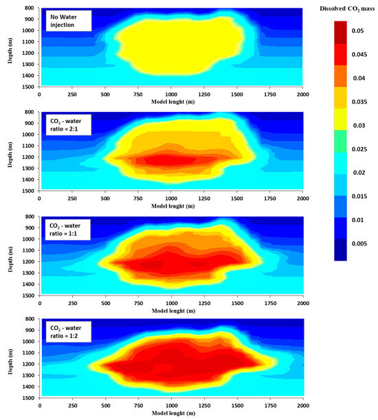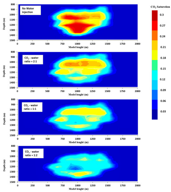 Two-dimensional cross-sectional viewpoints of the reservoir displaying the CO2 plume with the saturation of supercritical CO2 for the different CO2-water ratio scenarios at the end of the CO2 storage period.