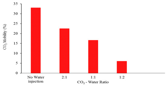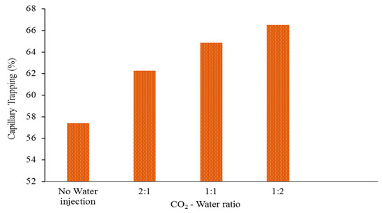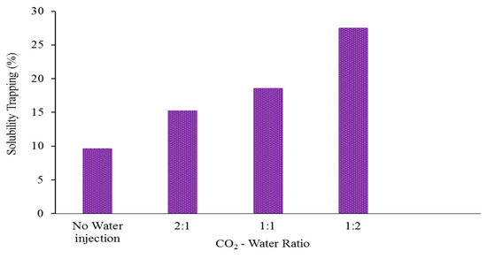 Furthermore, the data presented in Figure 7, Figure 8 and Figure 9 clearly demonstrate that a low CO2-water ratio has a substantial positive impact on the efficiency of CO2 trapping. First and foremost, the findings indicate that a low ratio of CO2-water maximises the capillary trapping of CO2. After being stored for 100 years, 66% of the CO2 capillary was trapped when the CO2-water ratio was 1:2. In contrast, only 64%, 62%, and 57% of the CO2 was trapped in the other scenarios (1:1 CO2-water ratio, 2:1 CO2-water ratio, and no water injection, respectively; Figure 7).