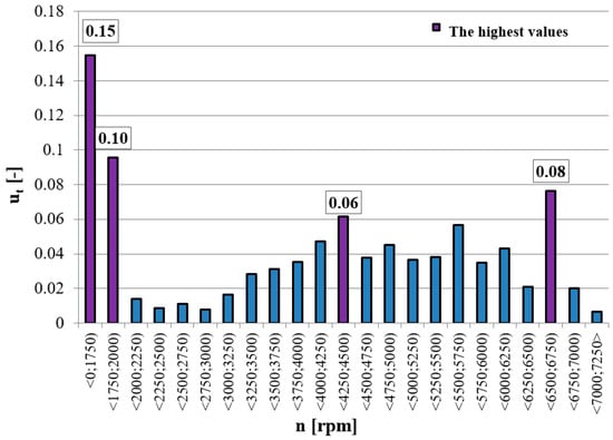 Research carried out in real operating conditions of three urban two-wheeled vehicles using equipment from the PEMS group made it possible to determine the most frequently used (in terms of overall duration) engine operating points [,,,] (Figure 1).