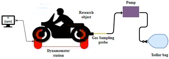 Samples of volatile organic compounds were collected into special sampling bags, two for each engine operating point, in order to average the results of subsequent chromatographic analysis. First, samples were taken from an urban two-wheeled vehicle while running at idle speed for different engine thermal states: cold (Sample 1) and hot (Sample 2). Another sample was obtained at a crankshaft speed of 4250 rpm–4500 rpm (Sample 3), and the last one was taken at an engine speed in the range of 6500 rpm–6750 rpm (Sample 4). The measurement station also included a probe and a pump (Figure 2).